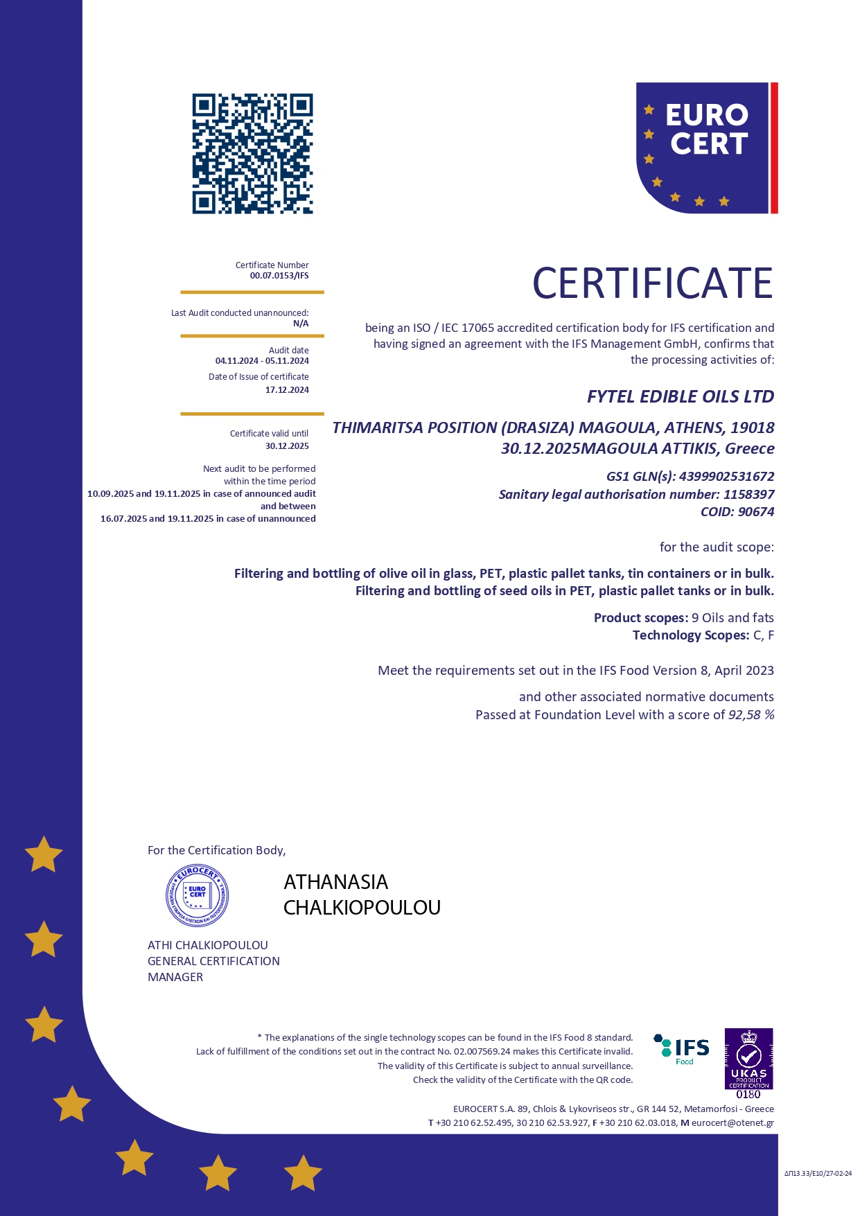 Για το λόγο αυτό πέρα των εσωτερικών ελέγχων που διενεργεί σε κάθε στάδιο της παραγωγικής της διαδικασίας πιστοποιείται και ελέγχεται από διεθνώς αναγνωρισμένο φορέα, με αποτέλεσμα την πλήρη εξασφάλιση του καταναλωτικού κοινού για προϊόντα ασφαλή για κατανάλωση διατηρώντας όλες τις διαθρεπτικές τους αξίες.
