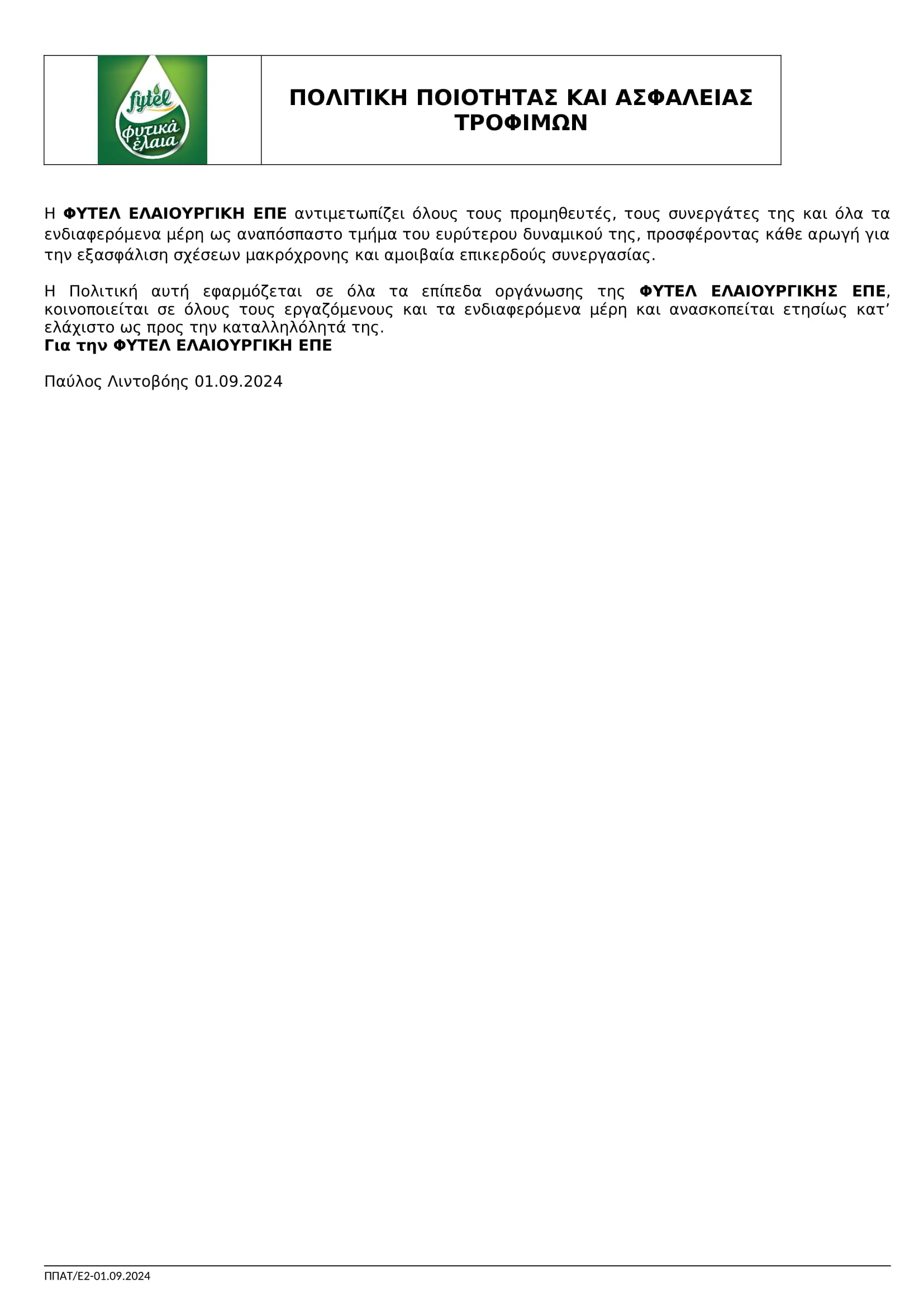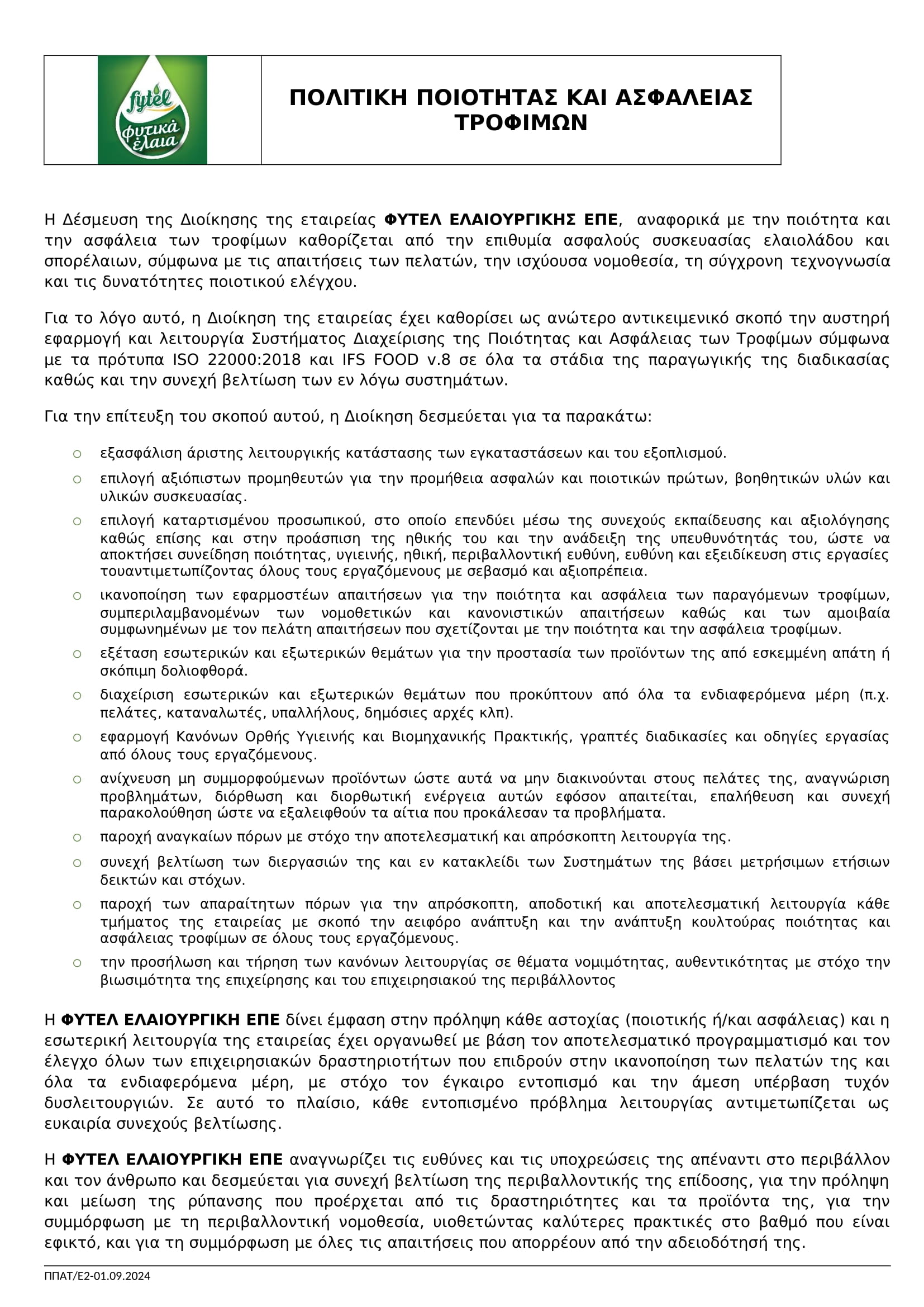 Υψίστης σημασίας επιδίωξη για την Φυτέλ Ελαιουργική είναι η ποιότητα